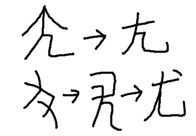 「尢(オウ)」に関しては、元々の意味が「足を曲げて立っている人」を意味する象形文字なので、元々の字はうにっと曲げて書いていたようです。